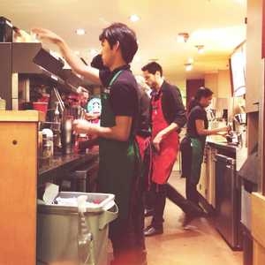 The elves are hard at work: brief flashes of green and red amidst the grinding, steaming, and 'Grande Cappuccino for Ralph!?'