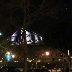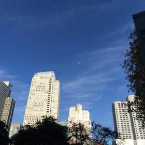 Gleaming in the cold, a plane flies over Yerba Buena Gardens