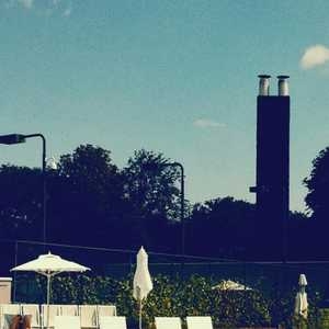 Two tall chimneys above a swimming pool. Suffocating, hot day.