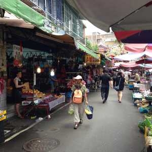 Biking through a street market on Minsheng West Road, down to Zhongshan North Road.