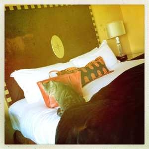Like a little furry Eloise. Between apartments for two weeks, but we were lucky to find a cat-friendly hotel!