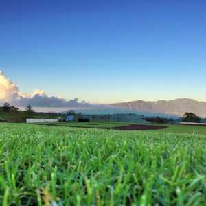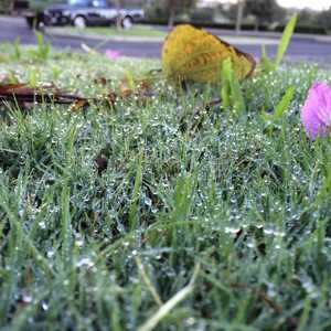 Dew on grass at a Kulamalu parking lot. In the car, Pono finishes up a native breakfast...