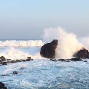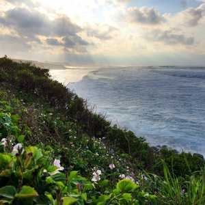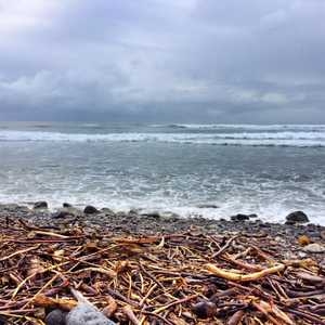 It's a stormy day and epic surf is rolling in (see the white line faintly visible way downhill).