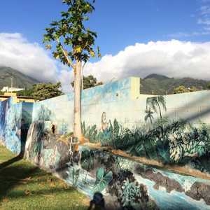 It is not incongruous to find a papaya tree growing in the middle of this muralized wall...
