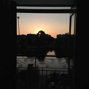 The sun cuts right through that house on the other side of the river.