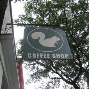 EXTERIOR. CAFE. Two girls in matching brown leather moto jackets sit with their backs to the wall on the long banquette seating.