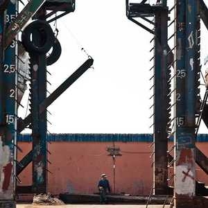 A mechanic stopped for his break between two boats in dry dock. A man between giants.