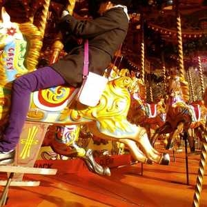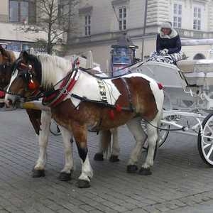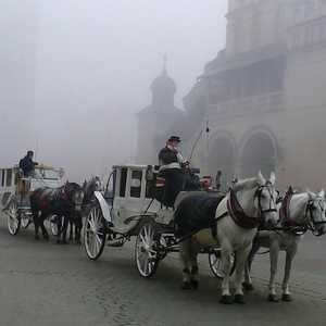 A cold, foggy day in Krakow, Poland. A market Square, St. Mary's Basilica. Lines awaited tourists who wanted to take a magical ride thru the city.
