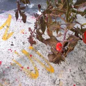 Admiring color-coordinated tomato plant and spray paint splatter on deck of new studio space. Happy to be around creatives.