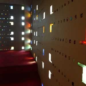 Afternoon sun through glass and brick, Pfeiffer chapel by Frank Lloyd Wright