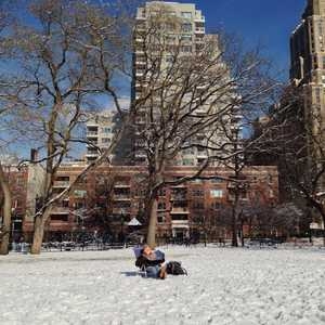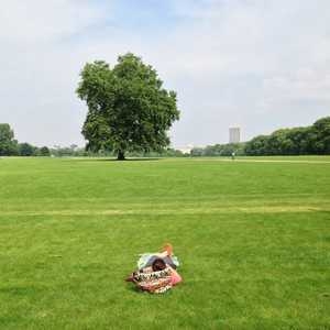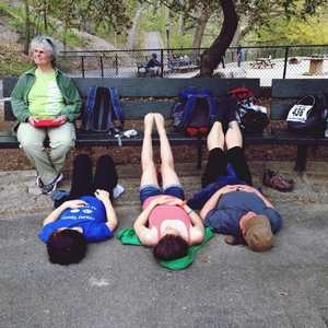 Resting and stretching during The Great Saunter, a 32 mile walk around the island of Manhattan.
