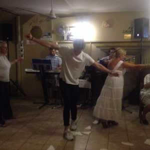 A night at the Taverna. Greek food & dancing. These days we throw napkins because they are cheaper than plates.
