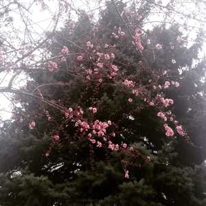 early blossoms greet/ old towering evergreens/ back 2 work 4 me!