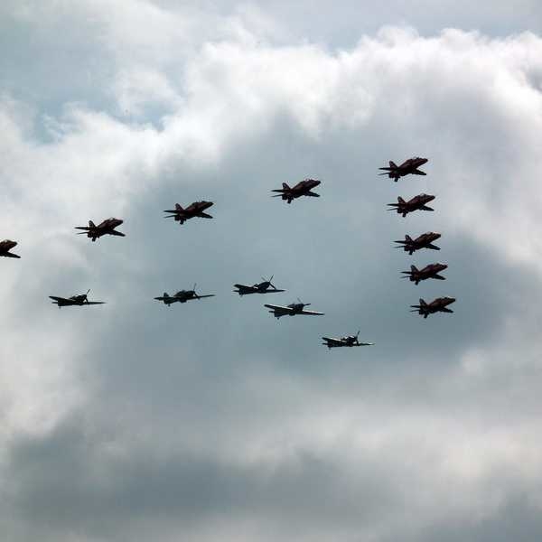 Westerham — That’s the 9 Hawk jets of the Red Arrows, and 3 Spitfires and 2 Hurricanes of the Battle of Britain Memorial Flight.